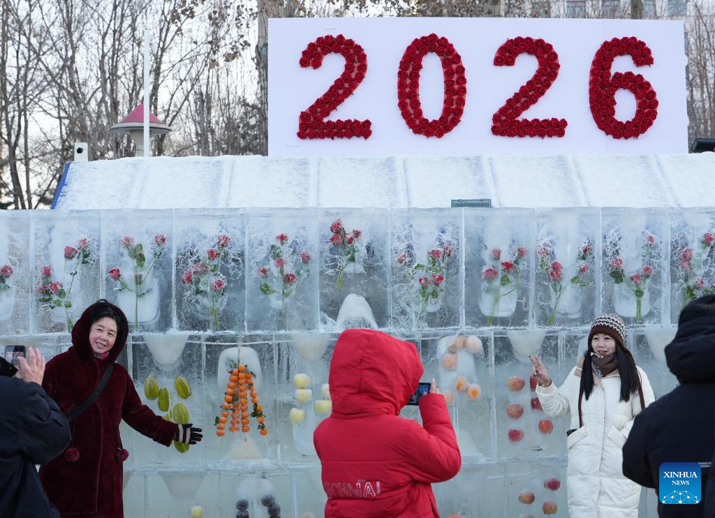 Citizens pose for photos with an ice installation in Shenyang, northeast China's Liaoning Province on Jan. 1, 2026. People across China celebrate the arrival of 2026 with a wide range of festivities on Thursday, the first day of the year. (Xinhua/Li Gang)