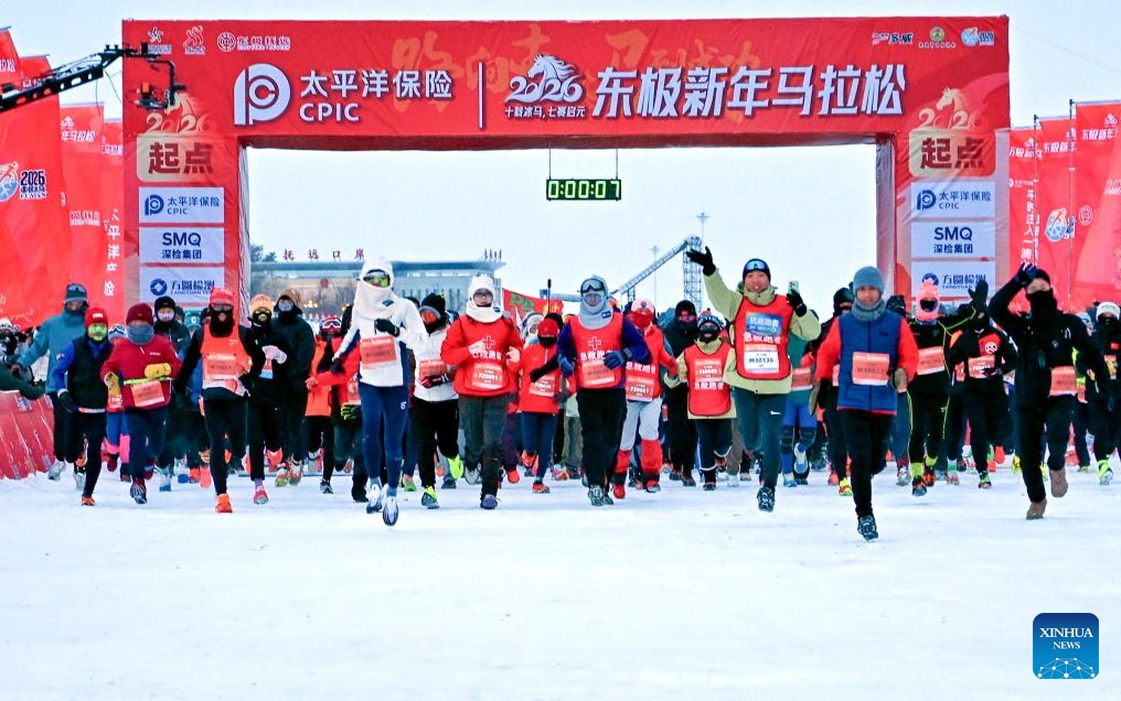 Contestants set off from the starting line during a marathon held in Fuyuan of Jiamusi, northeast China's Heilongjiang Province on Jan. 1, 2026. People across China celebrate the arrival of 2026 with a wide range of festivities on Thursday, the first day of the year. (Xinhua/Wang Chunyu)