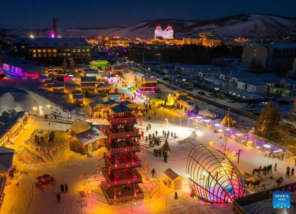 A drone photo shows tourists attending a New Year celebration event in Arxan City, north China's Inner Mongolia Autonomous Region, Dec. 31, 2025.