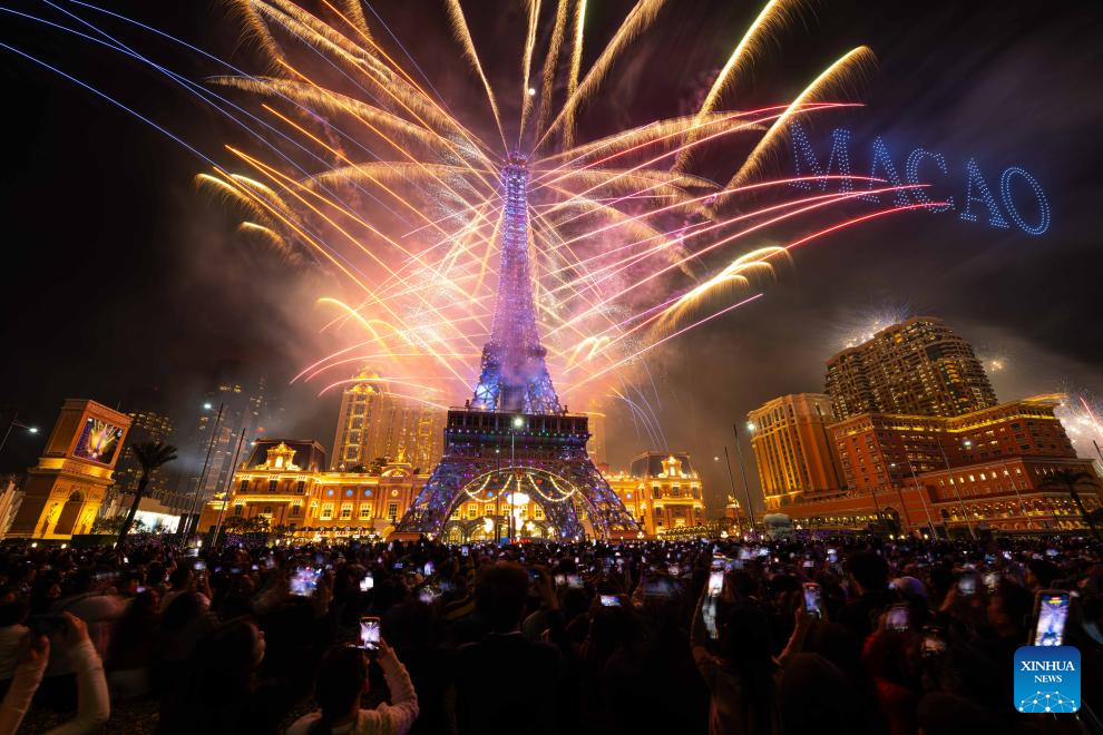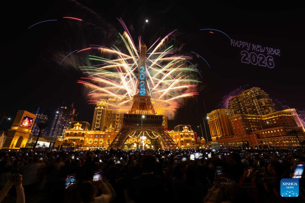 Fireworks light up the sky above Cotai Strip in celebration of the New Year in Macao, south China, Jan. 1, 2026.