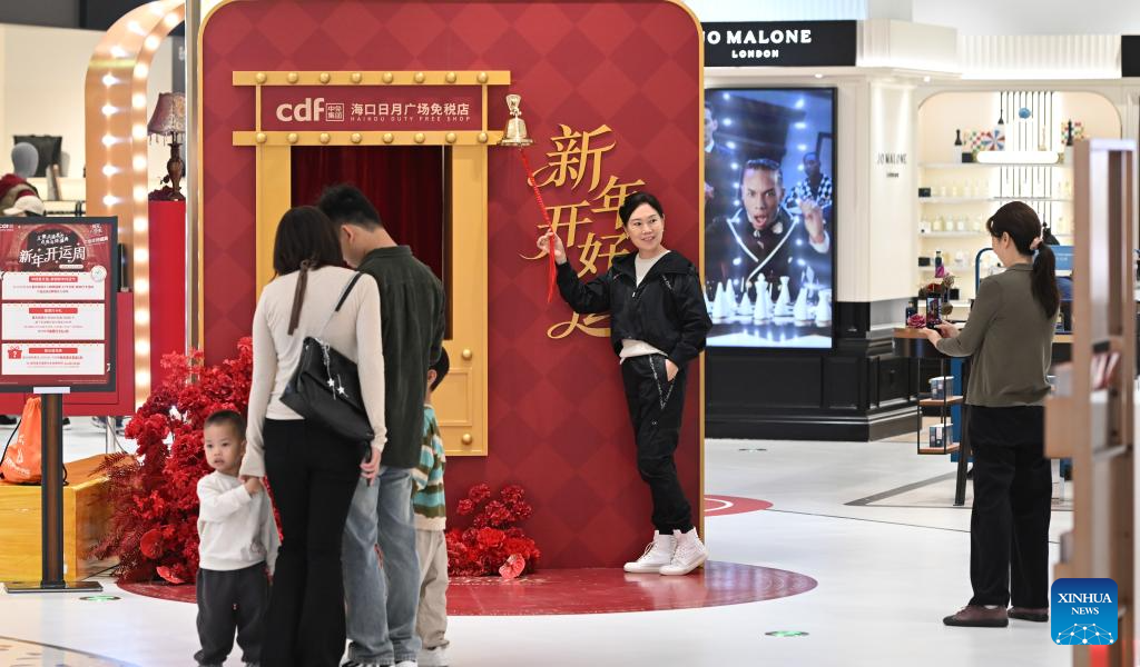 A customer poses for photos at a duty-free shop in Haikou, south China's Hainan Province on Jan. 1, 2026. People across China celebrate the arrival of 2026 with a wide range of festivities on Thursday, the first day of the year. (Xinhua/Yang Guanyu)