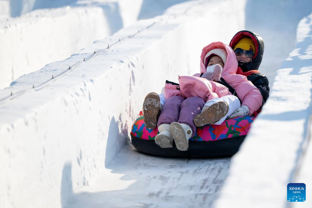 People enjoy snow slide during the 8th Harbin Songhua River Ice and Snow Carnival held in Harbin, northeast China's Heilongjiang Province on Jan. 1, 2026. People across China celebrate the arrival of 2026 with a wide range of festivities on Thursday, the first day of the year. (Xinhua/Zhang Tao)