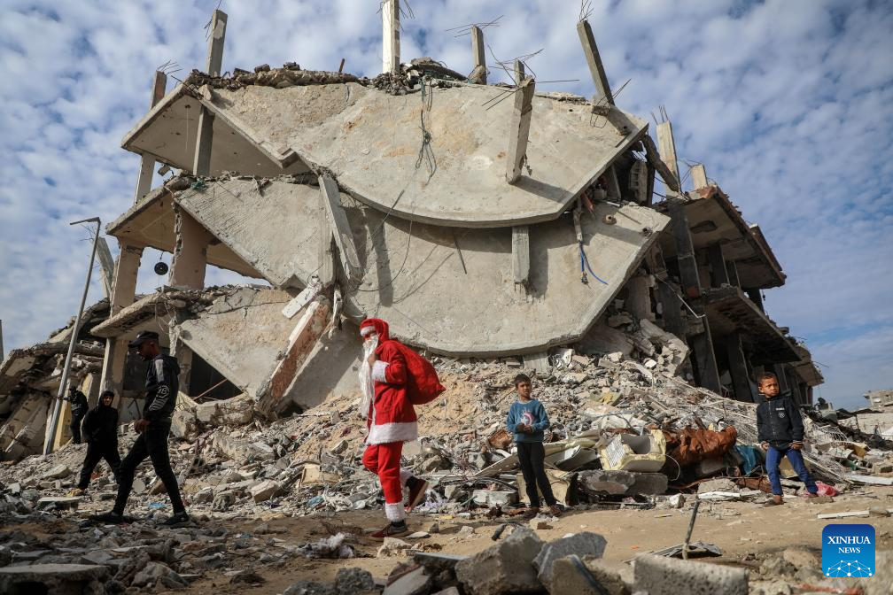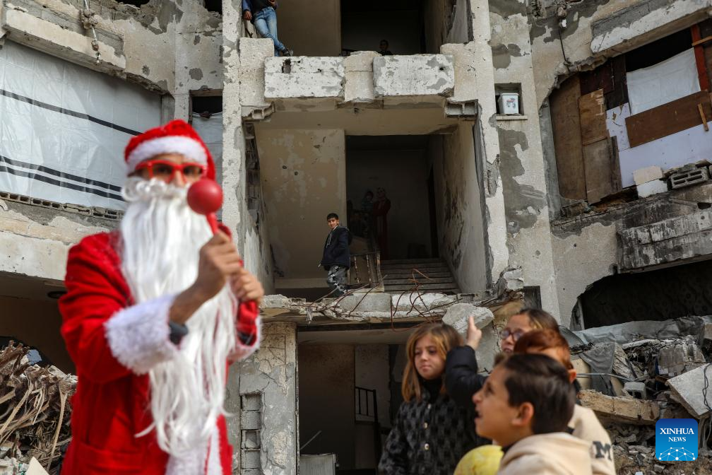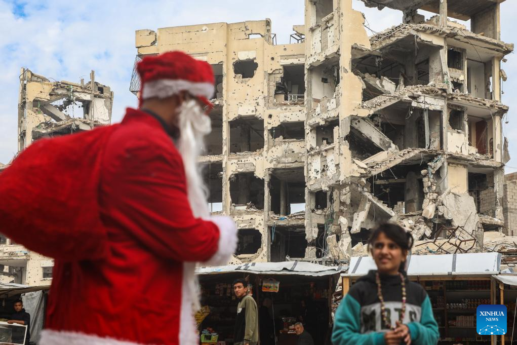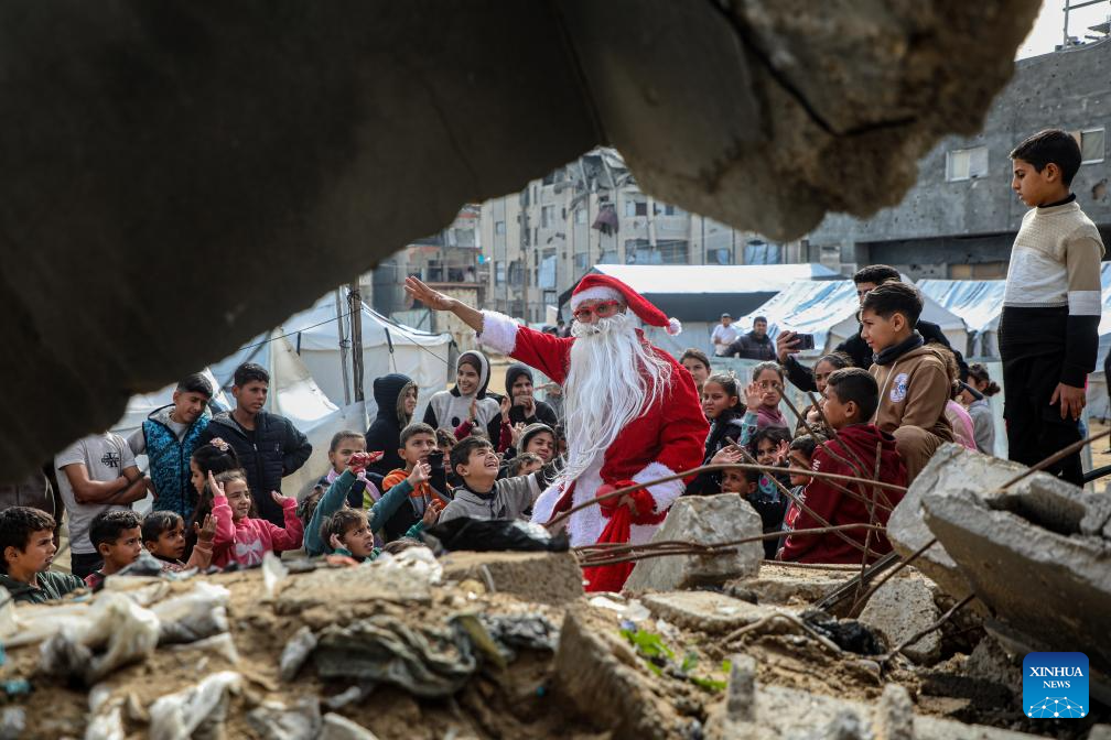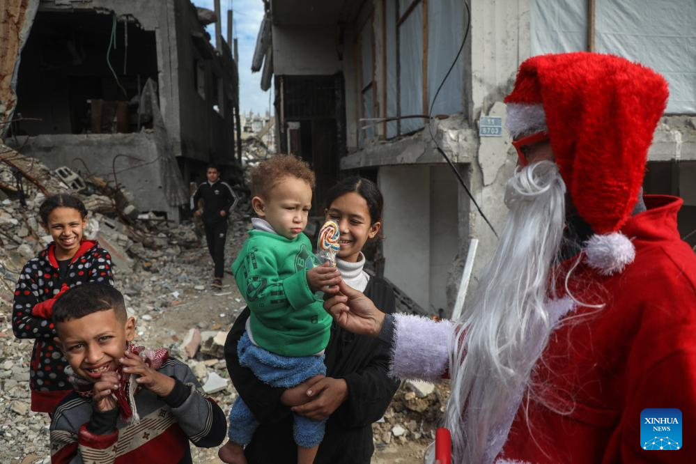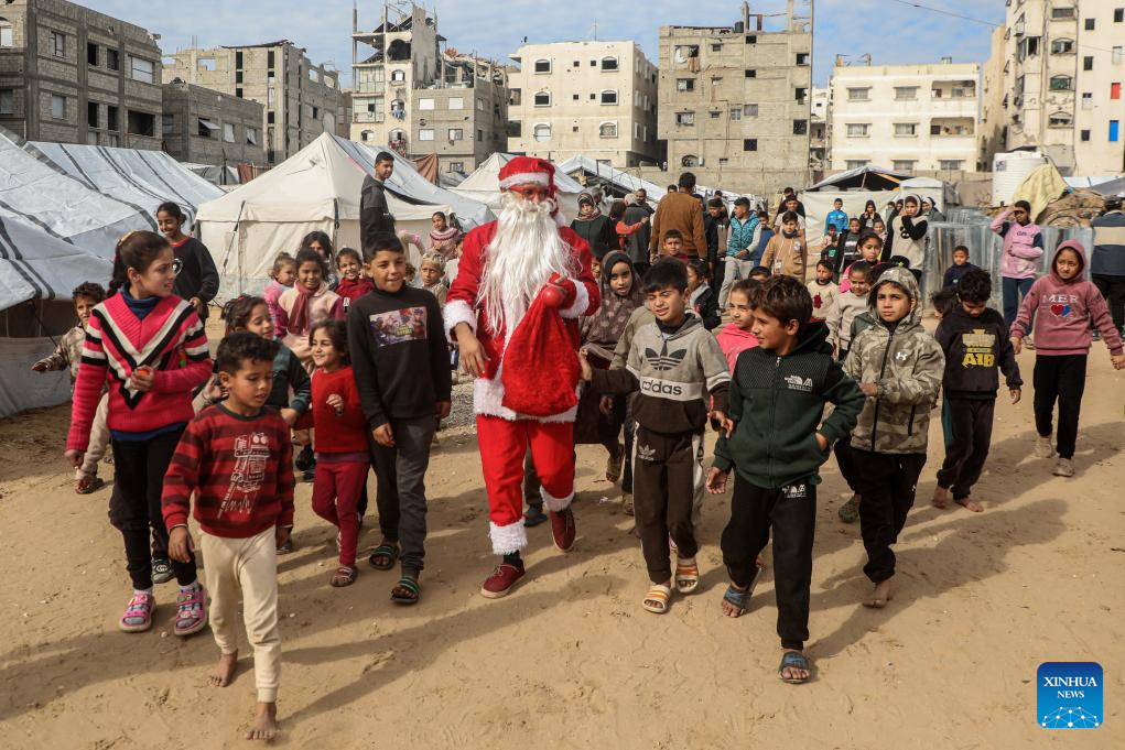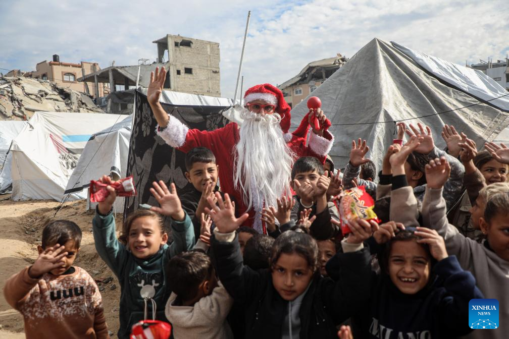 A young Palestinian man dressed as Santa Claus distributes sweets to displaced children ahead of the New Year at a temporary shelter in the Sheikh Radwan neighborhood, northwest of Gaza City, on Dec. 31, 2025. (Photo by Rizek Abdeljawad/Xinhua)