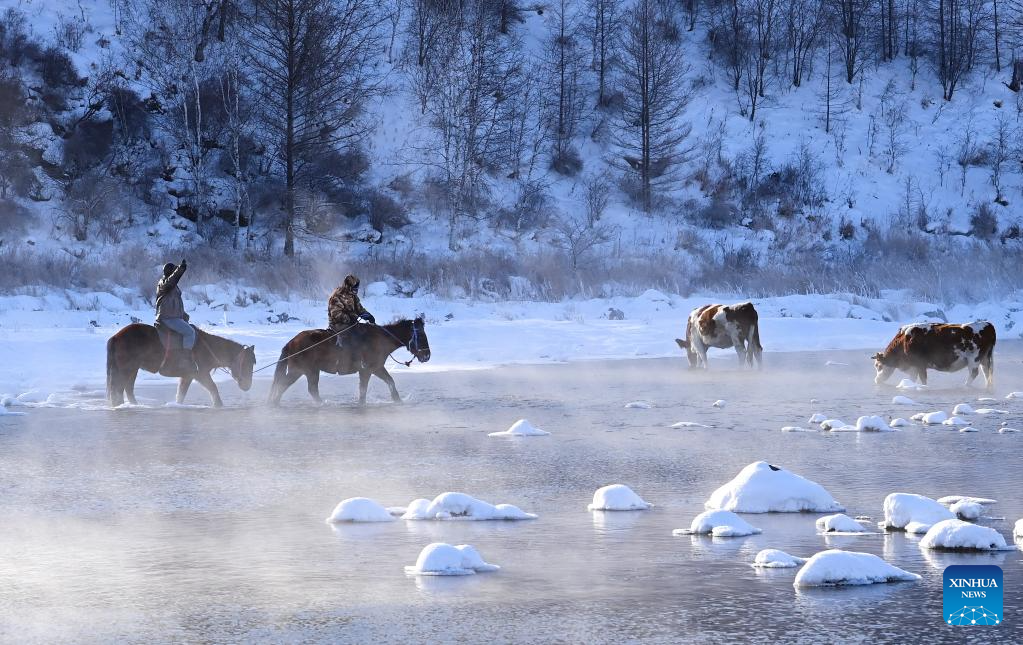 Tourists ride horses across the Halha River in the city of Arxan of Hinggan League, north China's Inner Mongolia Autonomous Region, Jan. 1, 2026. Despite Arxan's frigid winter cold, this geothermally-affected section of the Halha River never freezes, which attracts great amount of tourists in winter. (Photo by Wang Zheng/Xinhua)