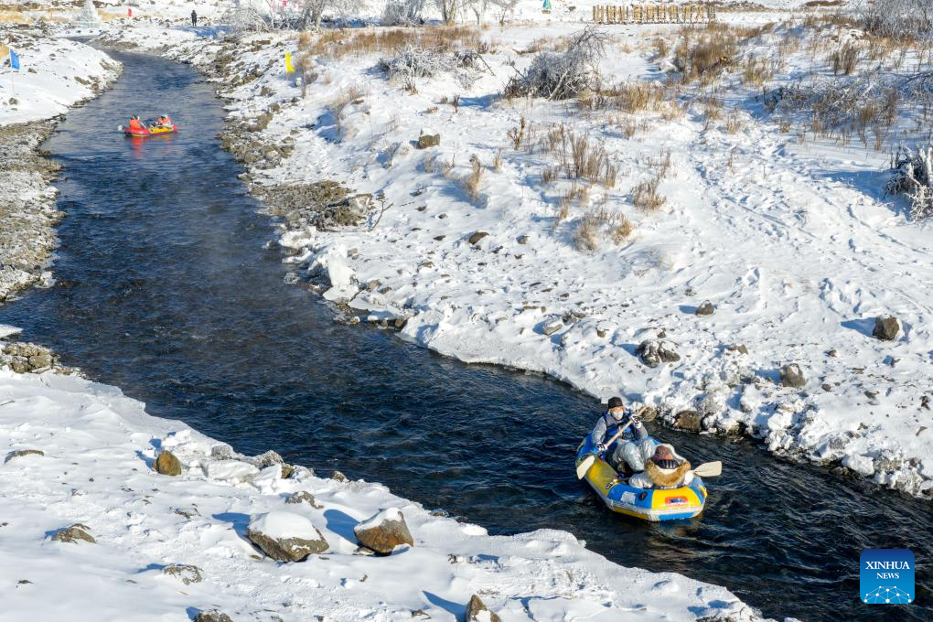 An aerial drone photo shows tourists rafting on the Halha River in the city of Arxan of Hinggan League, north China's Inner Mongolia Autonomous Region, Jan. 1, 2026. Despite Arxan's frigid winter cold, this geothermally-affected section of the Halha River never freezes, which attracts great amount of tourists in winter. (Xinhua/Ma Jinrui)
