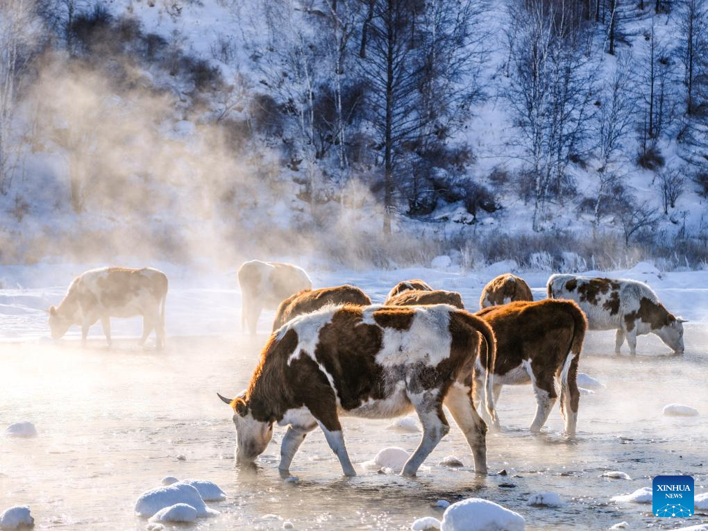 Cattle drink water in the Halha River in the city of Arxan of Hinggan League, north China's Inner Mongolia Autonomous Region, Jan. 1, 2026. Despite Arxan's frigid winter cold, this geothermally-affected section of the Halha River never freezes, which attracts great amount of tourists in winter. (Xinhua/Ma Jinrui)