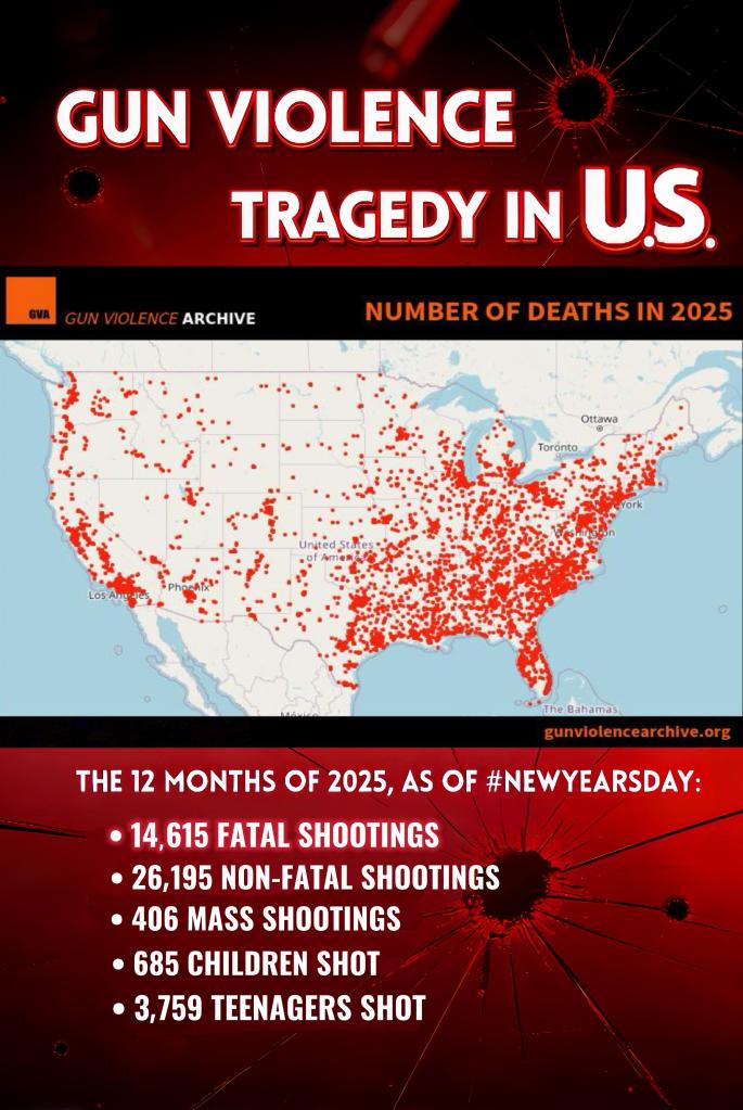 Gun violence remains a devastating problem in the United States. A total of 14,615 people were killed and 26,195 injured in 2025 in the country, according to Gun Violence Archive.