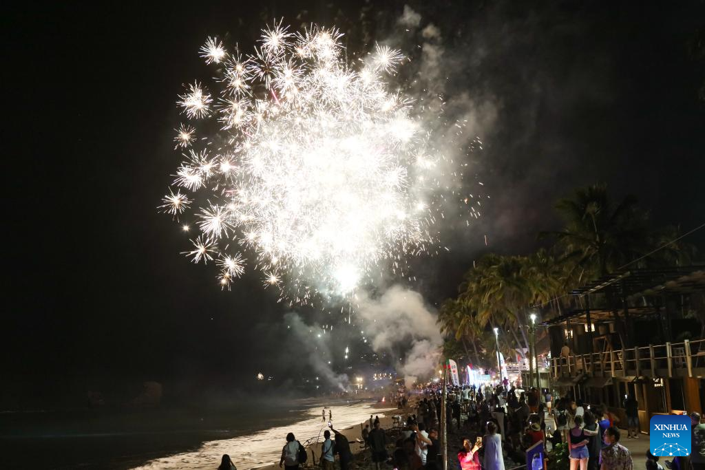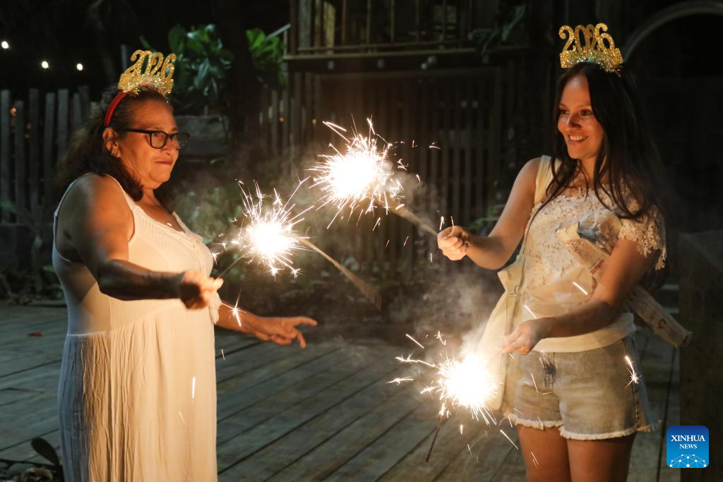 People celebrate the New Year at El Tunco Beach, La Libertad, El Salvador, Dec. 31, 2025. (Photo by Alexander Pena/Xinhua)