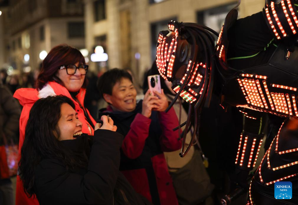 People interact with a performer during the new year parade in Rome, Italy, Jan. 1, 2026. (Xinhua/Li Jing)