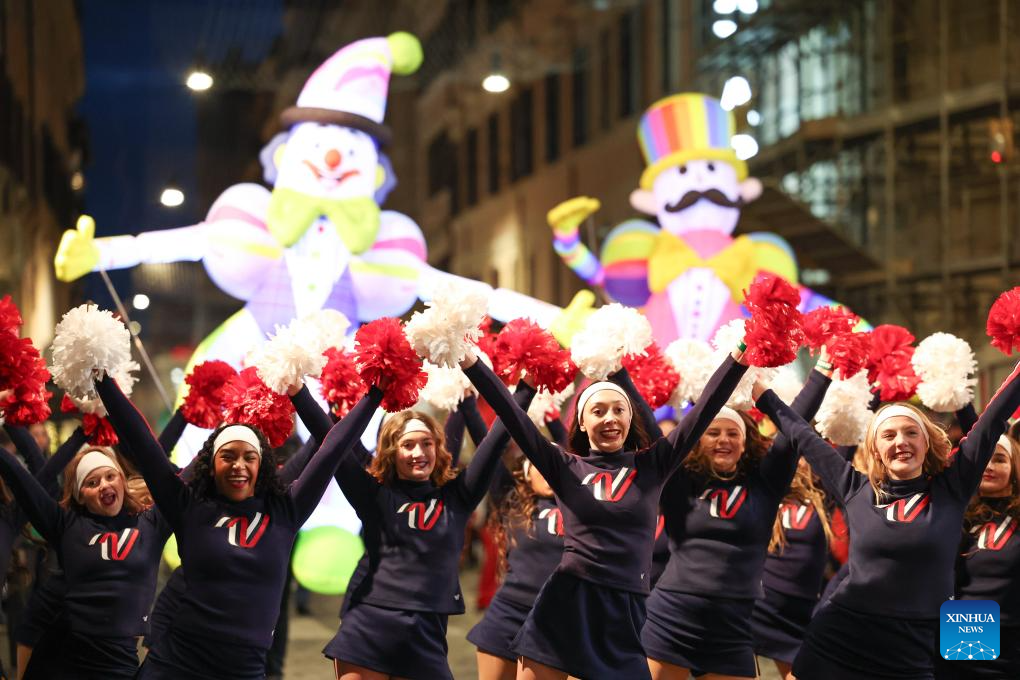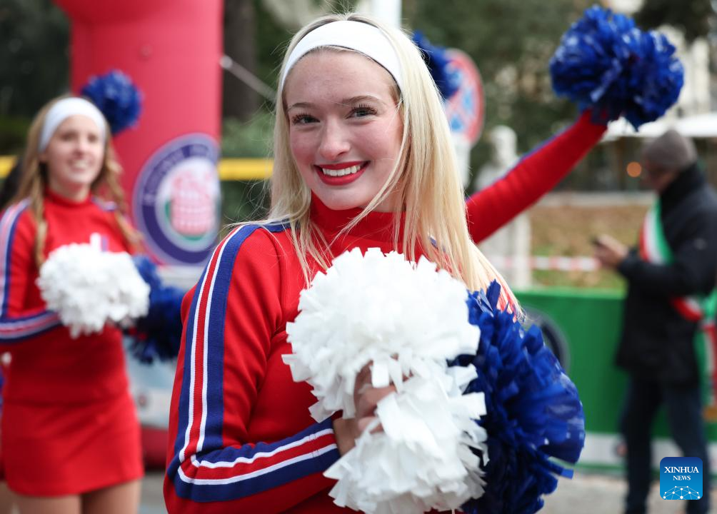 Cheerleaders perform during the new year parade in Rome, Italy, Jan. 1, 2026. (Xinhua/Li Jing)