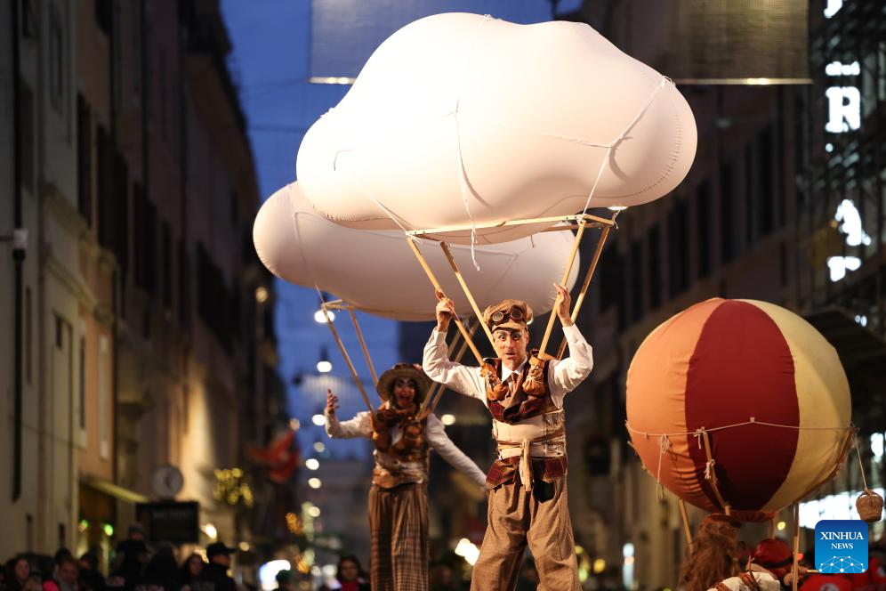 Stilt performers march during the new year parade in Rome, Italy, Jan. 1, 2026. (Xinhua/Li Jing)