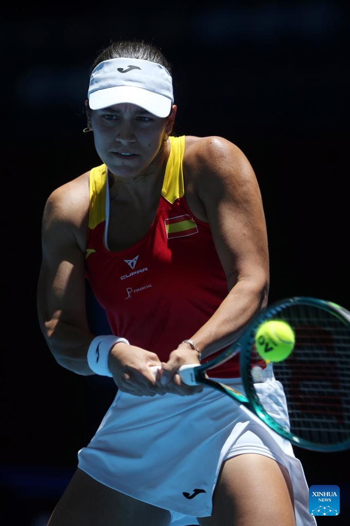 Jessica Bouzas Maneiro of Spain hits a return during the women's singles match against Solana Sierra of Argentina in the Group A round robin match between Spain and Argentina at the 2026 United Cup tennis tournament in Perth, Australia, Jan. 2, 2026. (Photo by Zhou Dan/Xinhua)
