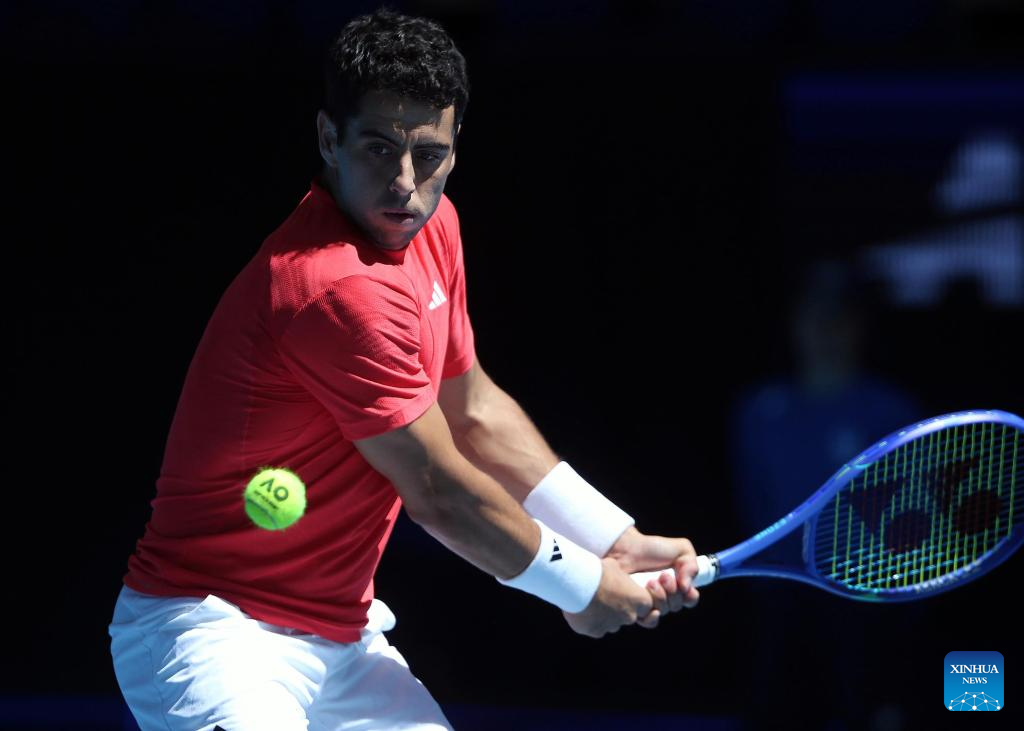 Sebastian Baez of Argentina hits a return during the men's singles match against Jaume Munar of Spain in the Group A round robin match between Spain and Argentina at the 2026 United Cup tennis tournament in Perth, Australia, Jan. 2, 2026. (Photo by Zhou Dan/Xinhua)