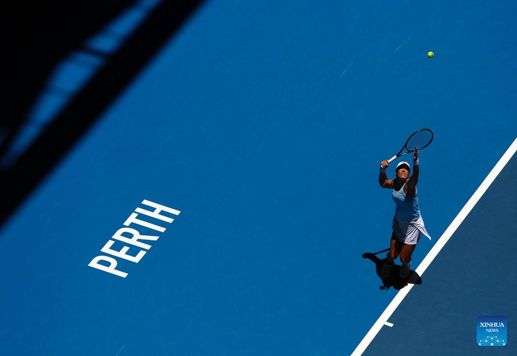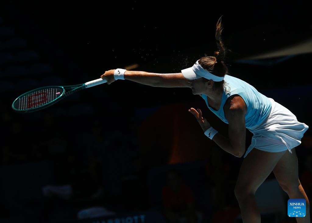 Solana Sierra of Argentina serves during the women's singles match against Jessica Bouzas Maneiro of Spain in the Group A round robin match between Spain and Argentina at the 2026 United Cup tennis tournament in Perth, Australia, Jan. 2, 2026. (Photo by Zhou Dan/Xinhua)