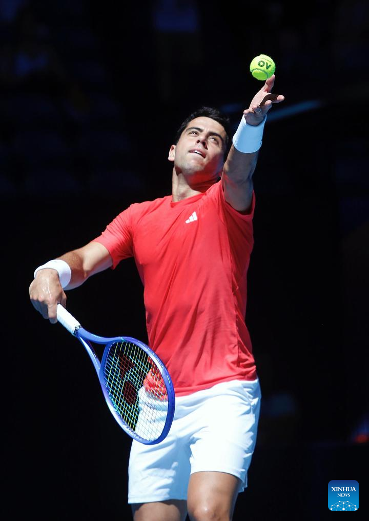 Jaume Munar of Spain serves during the men's singles match against Sebastian Baez of Argentina in the Group A round robin match between Spain and Argentina at the 2026 United Cup tennis tournament in Perth, Australia, Jan. 2, 2026. (Photo by Zhou Dan/Xinhua)
