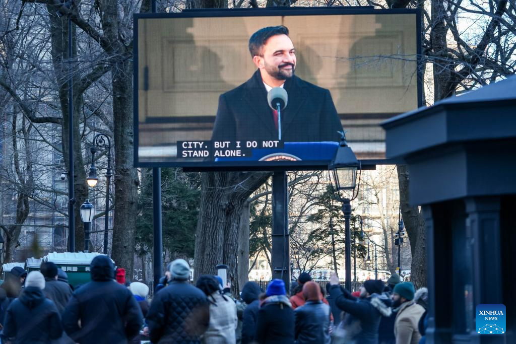 This photo shows a screen displaying Zohran Mamdani speaking during his inauguration ceremony in New York City, the United States, Jan. 1, 2026. Democrat Zohran Mamdani was sworn in as New York City mayor on Thursday, becoming the first Muslim leader of America's largest city by population with a vow to combat the city's affordability crisis. (Photo by Zack Zhang/Xinhua)