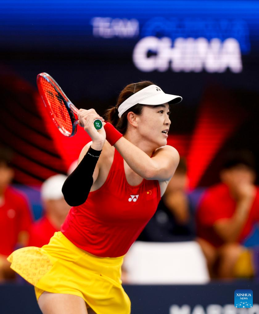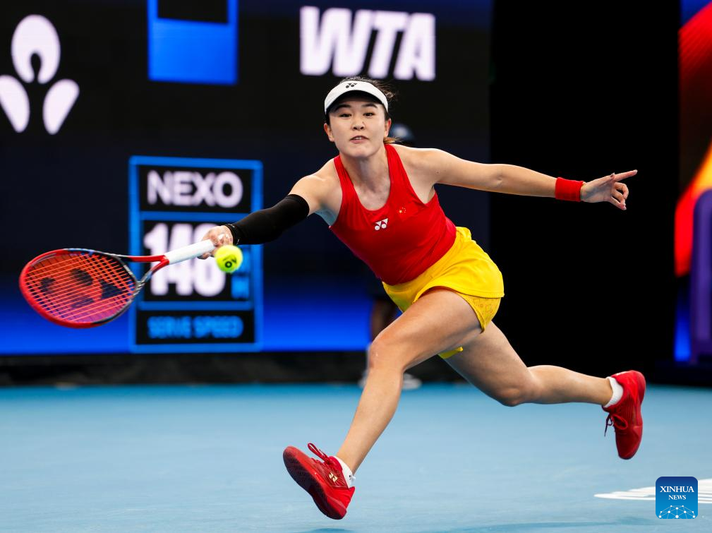 Zhu Lin of China hits a return to Elise Mertens of Belgium during the women's singles match in the Group B round robin match between China and Belgium at the 2026 United Cup tennis tournament in Sydney, Australia, Jan. 3, 2026. (Xinhua/Ma Ping)