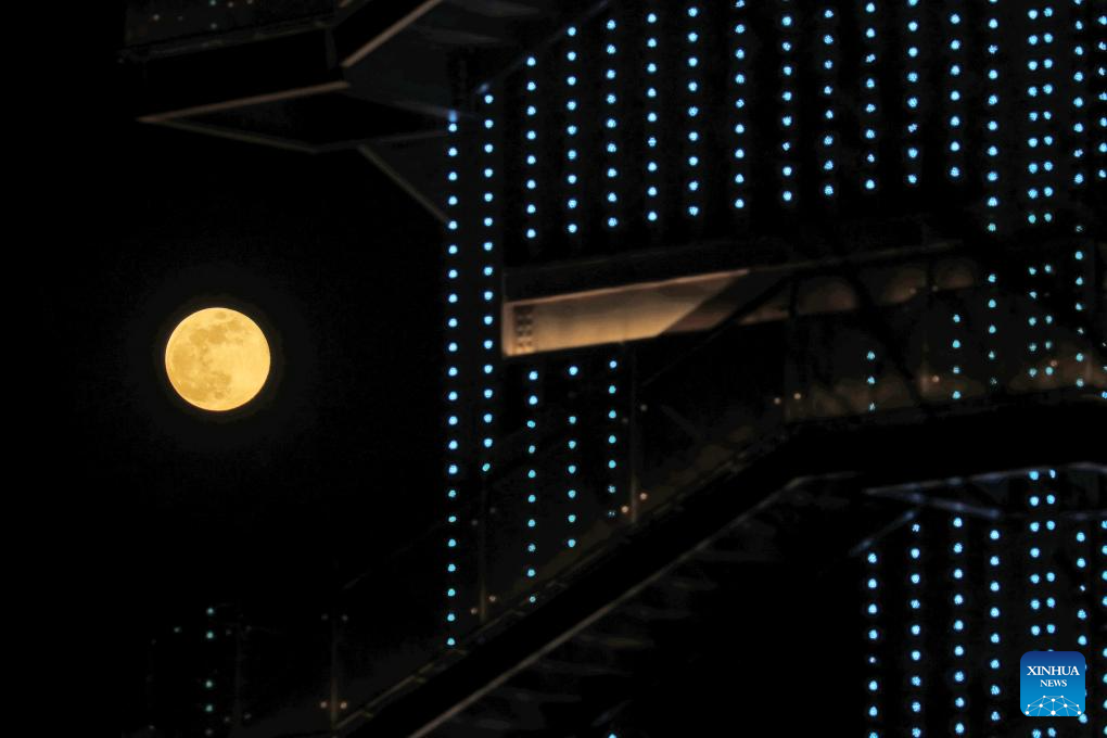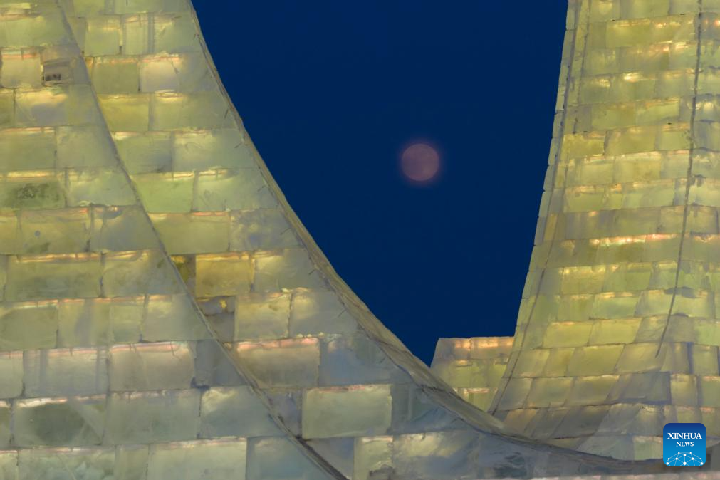 This photo taken on Jan. 3, 2026 shows the moon over the Ice-Snow World in Harbin City, northeast China's Heilongjiang Province. The first super moon of 2026, characterized by the moon's unusually close proximity to Earth, resulting in a larger and brighter appearance, showed in the sky on Saturday. (Photo by Zhang Shu/Xinhua)