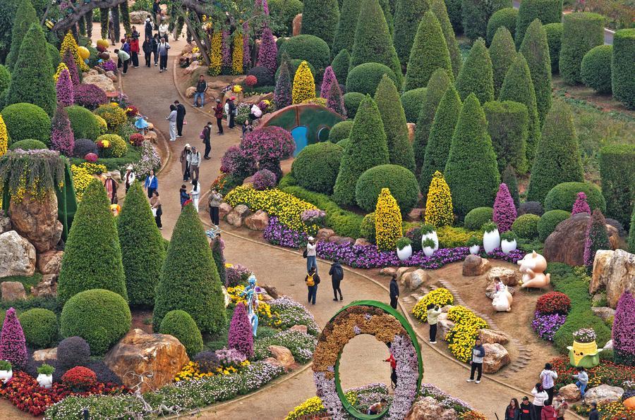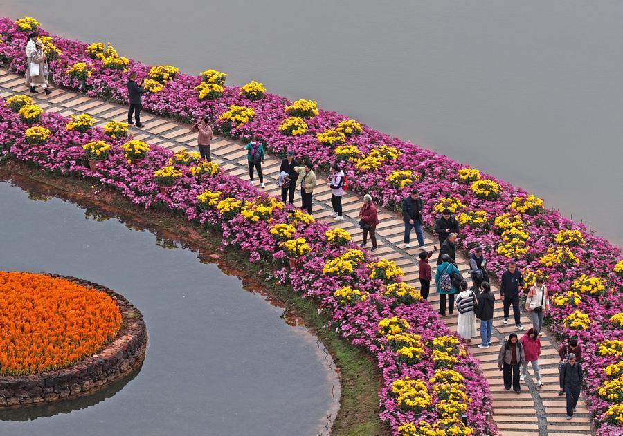 This aerial drone photo taken on Jan. 3, 2026 shows tourists viewing chrysanthemum flowers at a scenic area in Nanning, south China's Guangxi Zhuang Autonomous Region. (Xinhua/Zhou Hua)