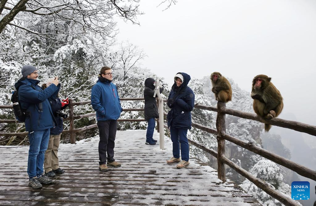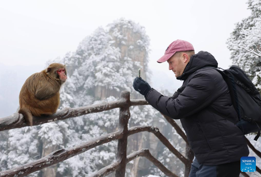 A foreign tourist takes photos of a macaque at Huangshizhai scenic spot of Zhangjiajie National Forest Park after a snowfall in Zhangjiajie, central China's Hunan Province, Jan. 2, 2026. Snowfall hit many parts of China during the New Year's Day holiday, drawing tourists to enjoy the snowy scenery. (Photo by Wu Yongbing/Xinhua)