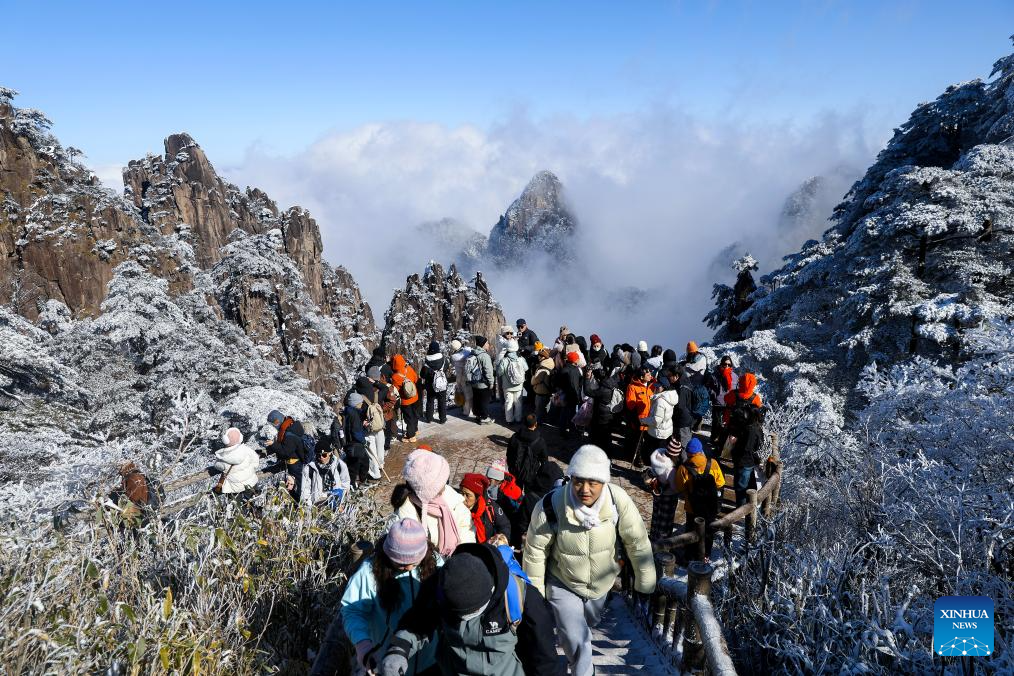 Tourists visit the Huangshan Mountain scenic area after a snowfall in Huangshan City, east China's Anhui Province, Jan. 2, 2026. Snowfall hit many parts of China during the New Year's Day holiday, drawing tourists to enjoy the snowy scenery. (Photo by Fan Chengzhu/Xinhua)