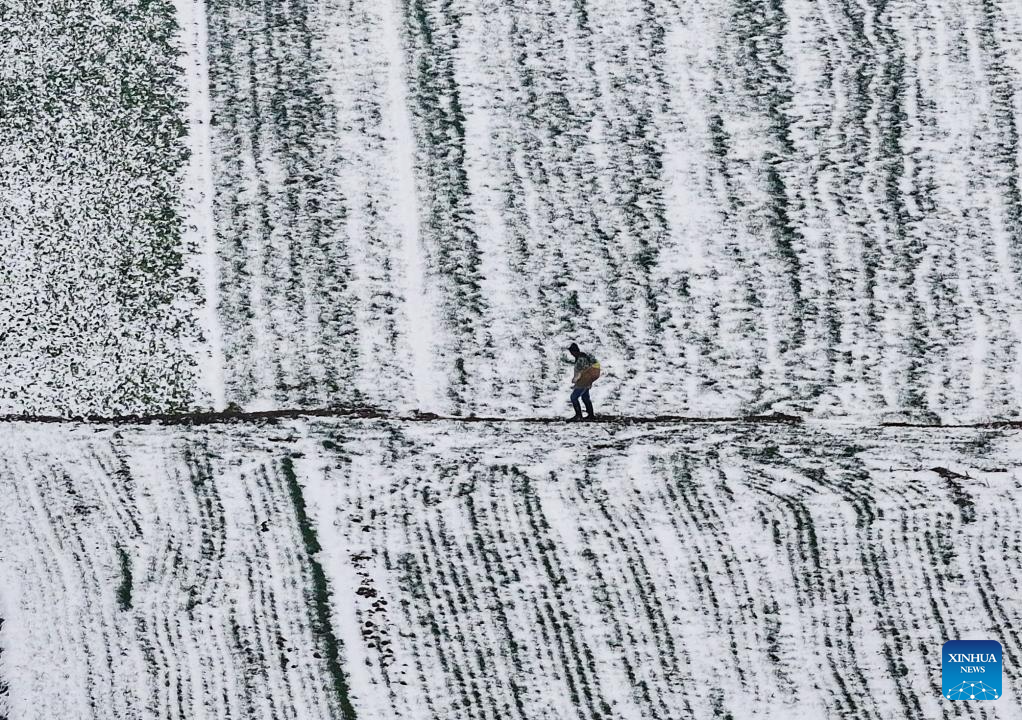 This photo taken on Jan. 1, 2026 shows a man walking in a wheat field after a snowfall in Xiangyang City, central China's Hubei Province. Snowfall hit many parts of China during the New Year's Day holiday, drawing tourists to enjoy the snowy scenery. (Photo by Xie Yong/Xinhua)