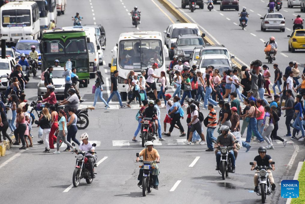 This file photo shows pedestrians crossing the street in downtown Caracas, Venezuela, Dec. 31, 2025. Social media users reported bombings in Caracas, La Guaira and Nueva Esparta of Venezuela. (Photo by Marcos Salgado/Xinhua)
