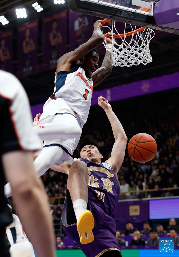 Edmond Sumner (L) of Guangdong Southern Tigers dunks during the 10th round regular season match between Beijing Royal Fighters and Guangdong Southern Tigers at the 2025-2026 Chinese Basketball Association (CBA) league in Beijing, China, Jan. 3, 2026. (Xinhua/Wang Lili)