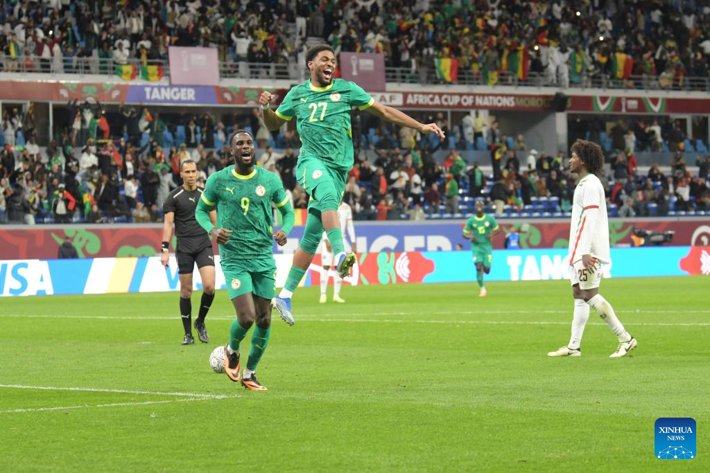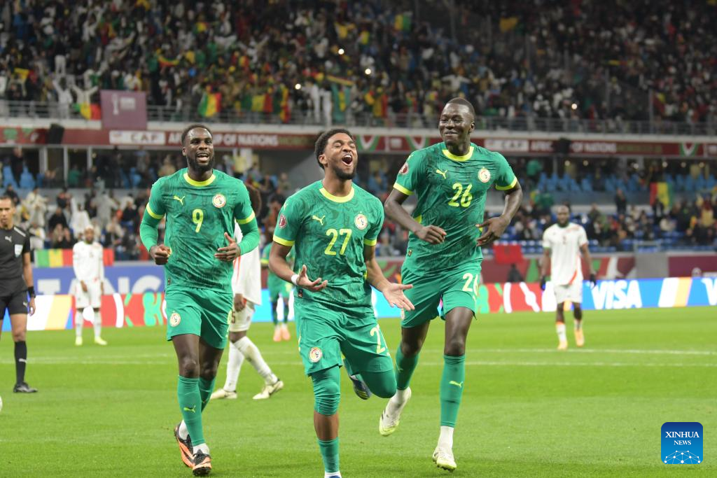 Senegal's Ibrahim Mbaye (C) celebrates scoring his team's third goal during round of 16 football match between Senegal and Sudan at the CAF Africa Cup of Nations 2025 in Tangiers, Morocco, Jan. 3, 2026. (Photo by Aissa/Xinhua)