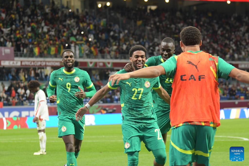 Senegal's Ibrahim Mbaye (2nd L) celebrates scoring his team's third goal during round of 16 football match between Senegal and Sudan at the CAF Africa Cup of Nations 2025 in Tangiers, Morocco, Jan. 3, 2026. (Photo by Aissa/Xinhua)