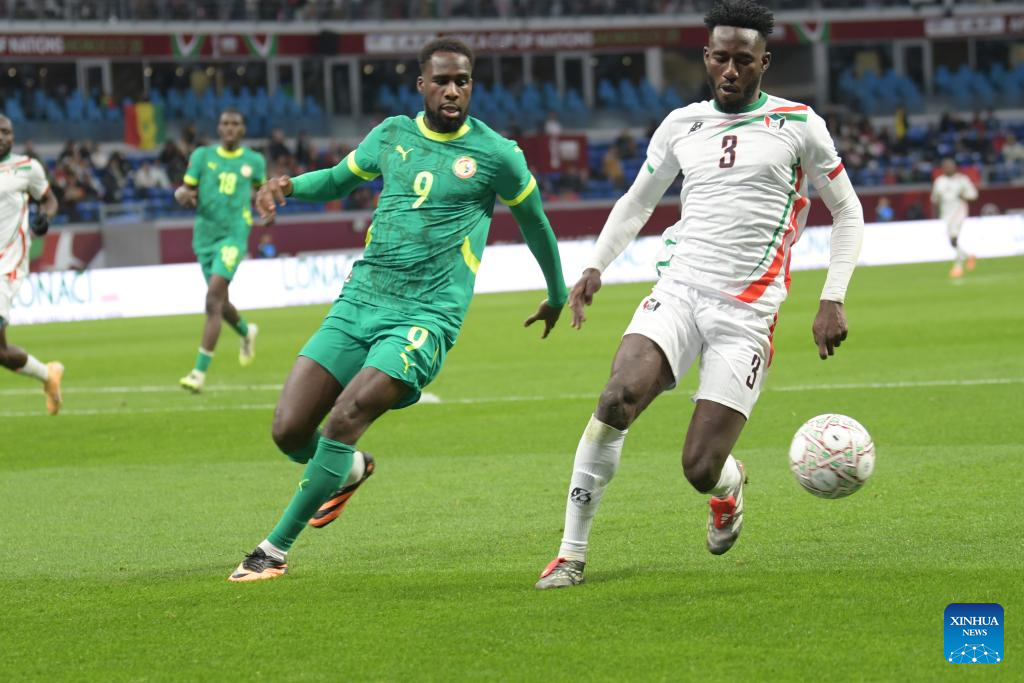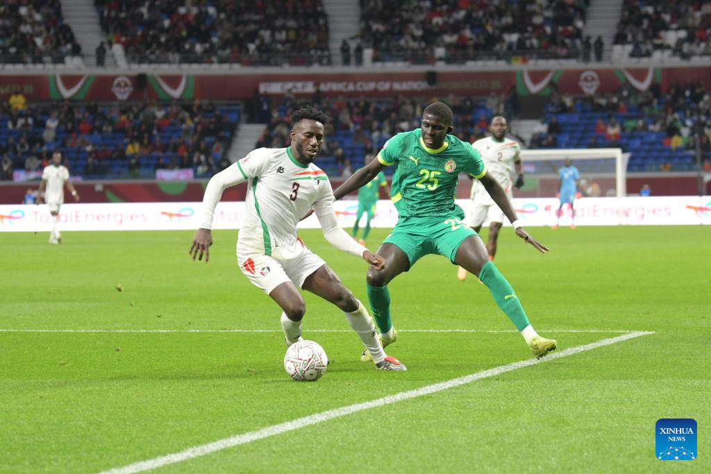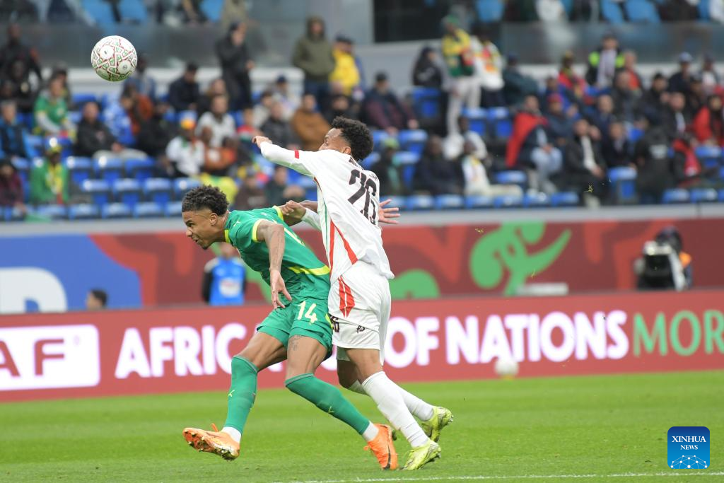 Sudan's Mohamed Saeed Ahmed (R) contests the ball with Senegal's Boulaye Dia during round of 16 football match between Senegal and Sudan at the CAF Africa Cup of Nations 2025 in Tangiers, Morocco, Jan. 3, 2026. (Photo by Aissa/Xinhua)