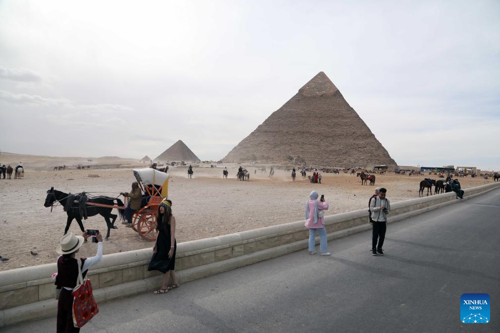 This photo taken on Jan. 1, 2026 shows tourists visiting the Pyramids of Giza in Egypt. (Xinhua/Ahmed Gomaa)