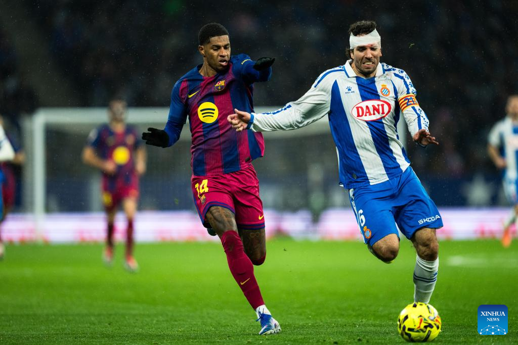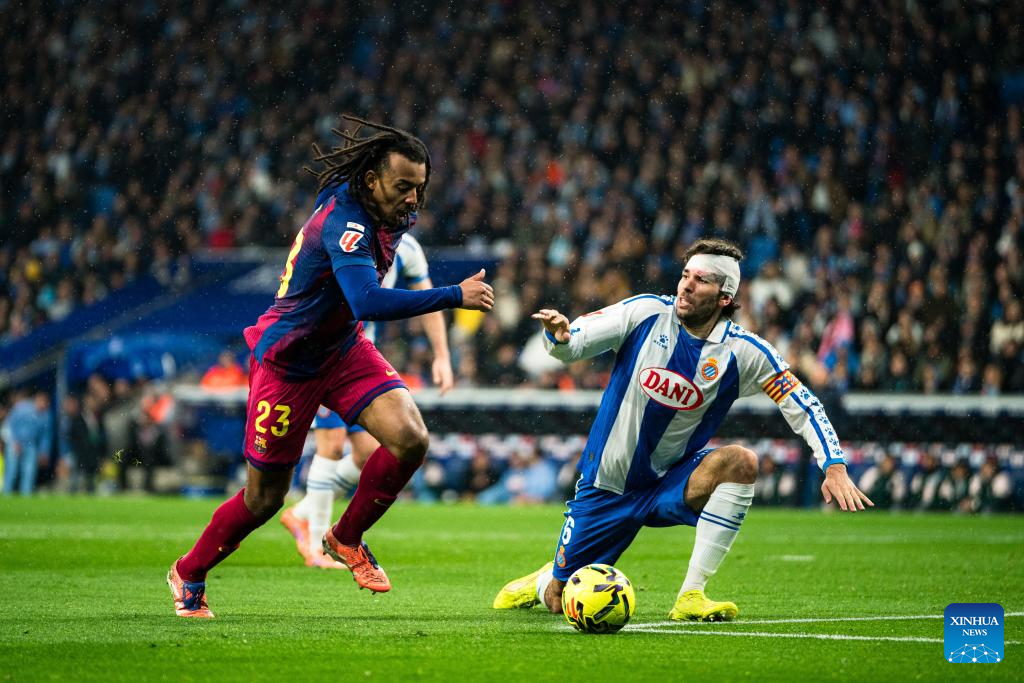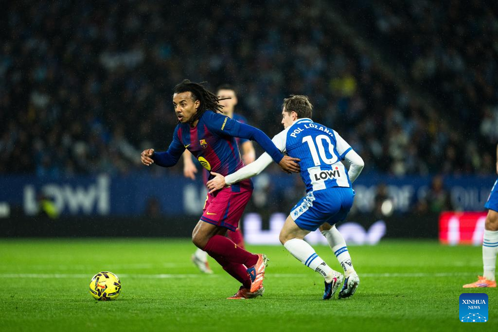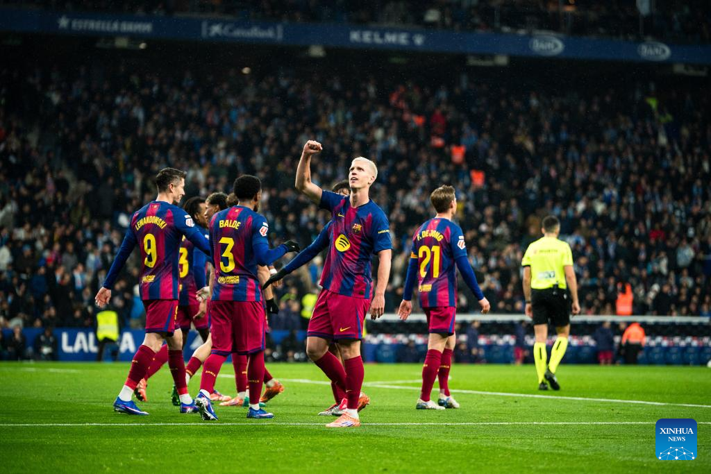 MADRID, Jan. 3 (Xinhua) -- La Liga leader FC Barcelona rode its luck before two late goals from Dani Olmo and Robert Lewandowski assured a 2-0 win away to local rivals Espanyol on Saturday.