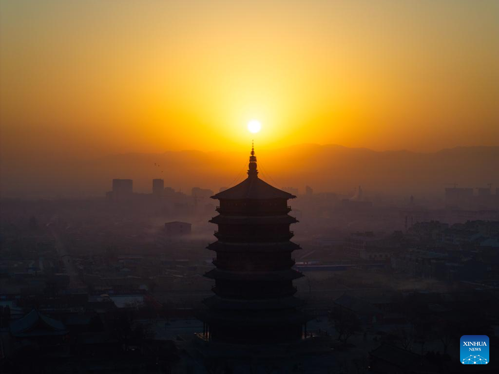 An aerial drone photo taken on Feb. 27, 2025 shows the Sakyamuni Pagoda of Fogong Temple in Yingxian County, north China's Shanxi Province. (Xinhua/Zhang Keren)