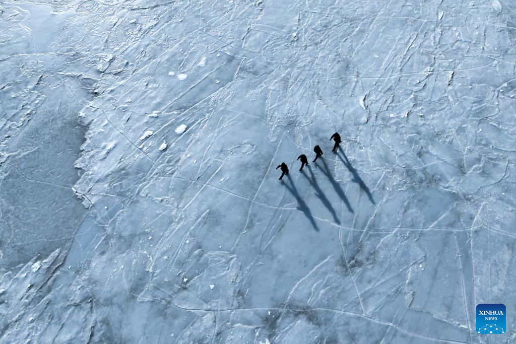 An aerial drone photo taken on Jan. 9, 2025 shows police officers patrolling on the ice-covered Qinghai Lake in Gangcha County of Haibei Tibetan Autonomous Prefecture, northwest China's Qinghai Province. (Xinhua/Zhang Long)