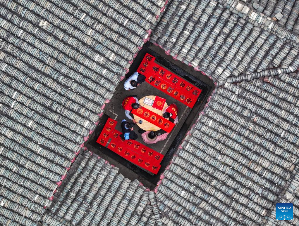 An aerial drone photo taken on Jan. 22, 2025 shows people writing Spring Festival couplets in Guitou Village of Daoxian County in Yongzhou, central China's Hunan Province. (Photo by Jiang Keqing/Xinhua)