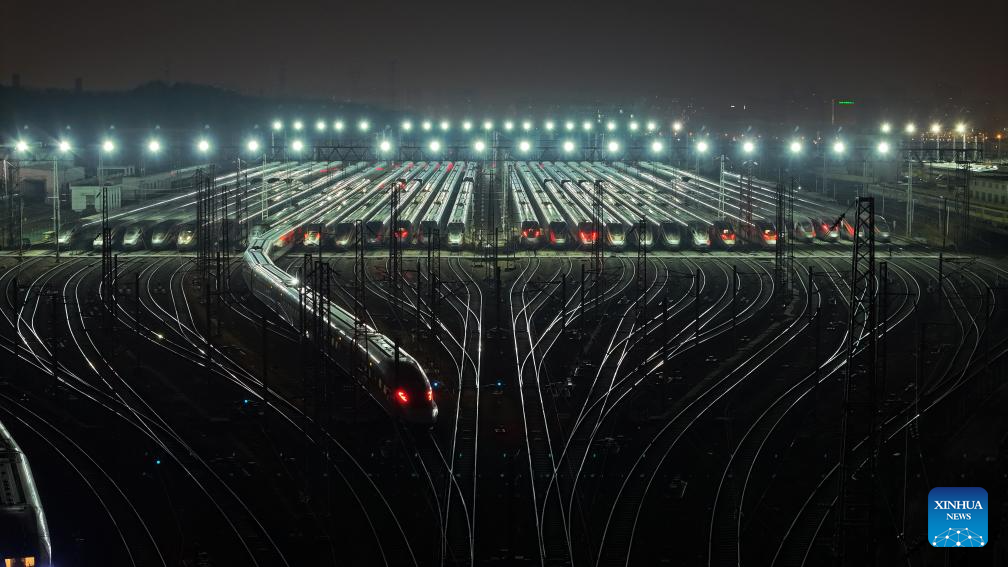 An aerial drone photo taken on Jan. 14, 2025 shows bullet trains at a maintenance base in Changsha, central China's Hunan Province. China's 2025 Spring Festival travel rush began on this day. (Xinhua/Chen Zhenhai)
