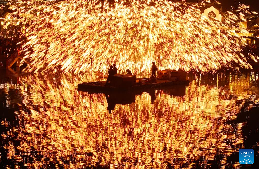 A drone photo taken on Jan. 29, 2025 shows folk artists performing a molten iron firework show in Nanyue District of Hengyang, central China's Hunan Province. (Photo by Cao Zhengping/Xinhua)