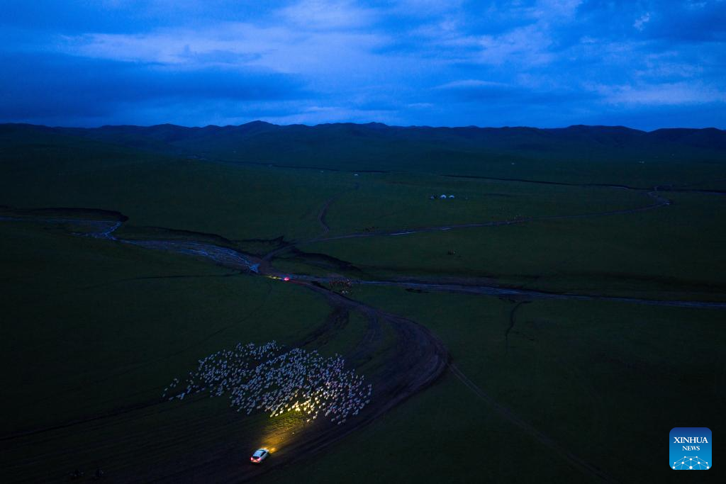 An aerial drone photo taken on June 14, 2025 shows herdsmen driving their livestock through the night on the way to a summer pasture on Ar Horqin Grassland, Chifeng, north China's Inner Mongolia Autonomous Region. (Xinhua/Ma Jinrui)