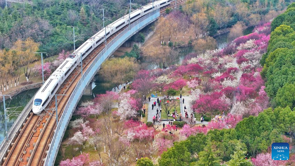 An aerial drone photo taken on Feb. 22, 2025 shows a train running past blooming plum flowers in Shushan District of Hefei, east China's Anhui Province. (Photo by Chen Sanhu/Xinhua)