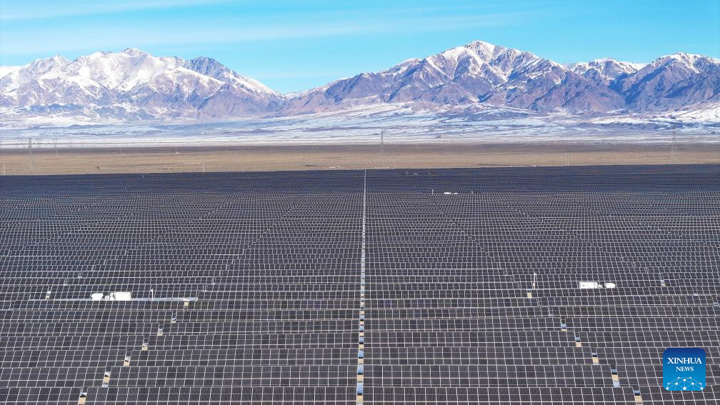 An aerial drone photo taken on Jan. 6, 2025 shows a partial view of the Shichengzi photovoltaic power station in Hami, northwest China's Xinjiang Uygur Autonomous Region. (Photo by Feng Yang/Xinhua)