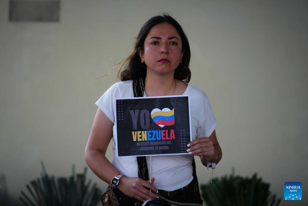 A woman holds a sign during a rally in support of Venezuela outside the U.S. Embassy in Bogota, Colombia, Jan. 3, 2026. The U.S. military launched a series of attacks against Venezuela early Saturday morning, reportedly capturing Venezuelan President Nicolas Maduro and flying him out of the country. (Photo by Andres Moreno/Xinhua)