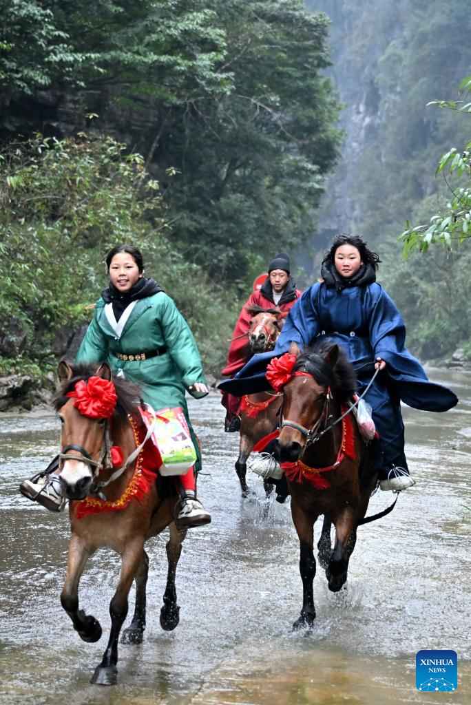 Tourists ride horses at a scenic spot in Enshi Tujia and Miao Autonomous Prefecture, central China's Hubei Province, Jan. 3, 2026. (Photo by Song Wen/Xinhua)