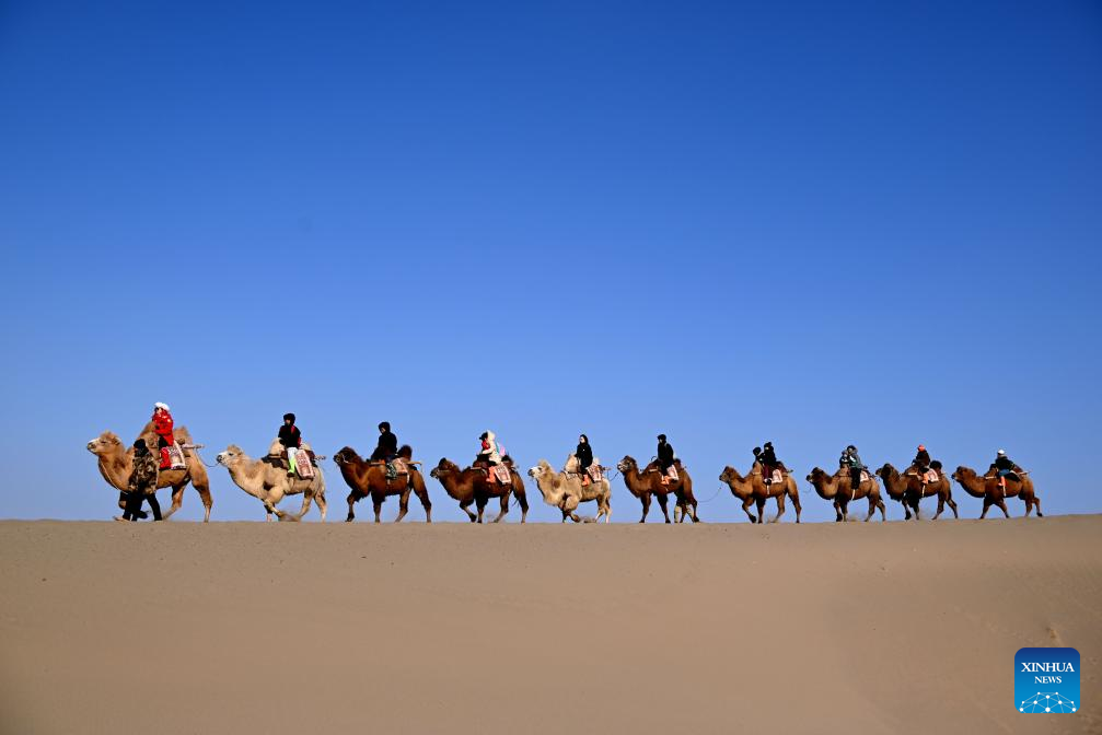 Tourists visit the Mingsha Mountain and Crescent Spring Scenic Area in Dunhuang, northwest China's Gansu Province, Jan. 2, 2026. (Photo by Zhang Xiaoliang/Xinhua)