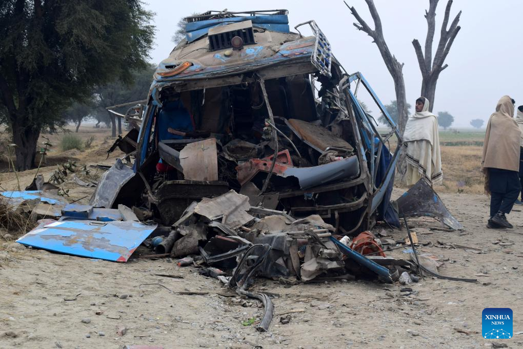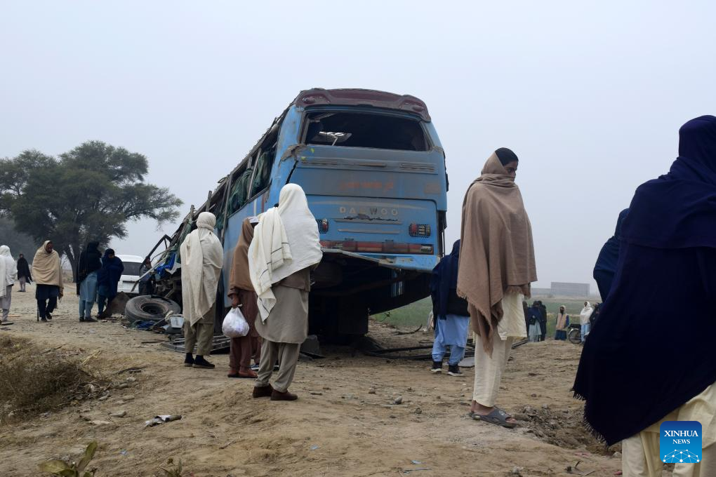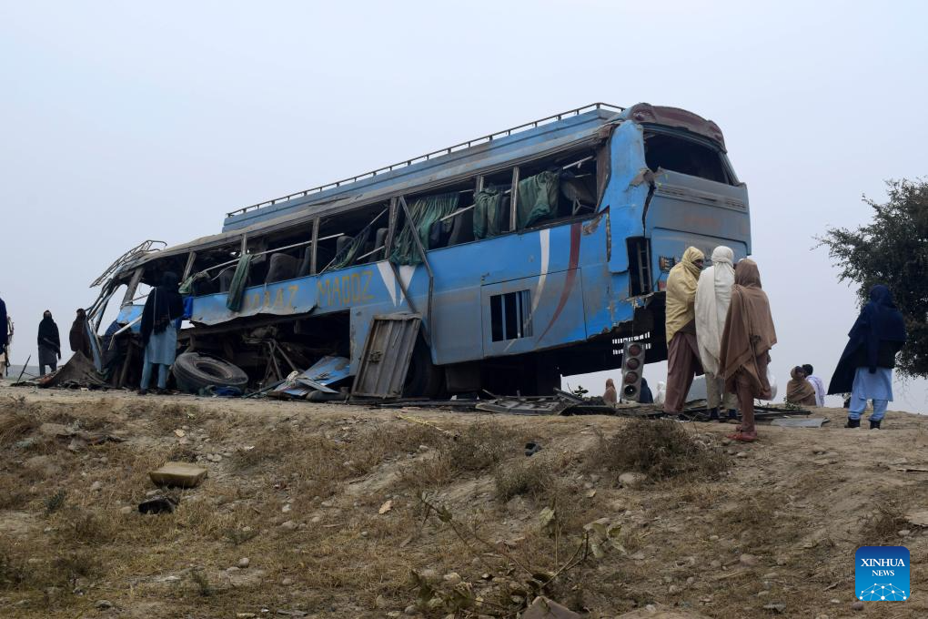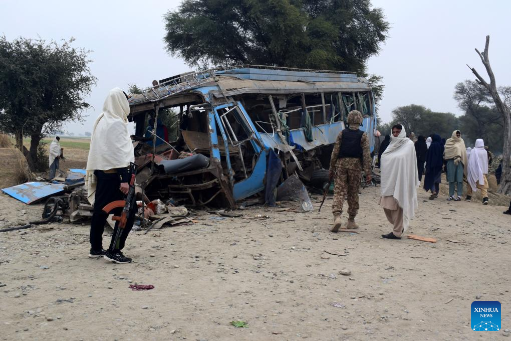 Locals gather near a bus wreckage after an improvised explosive device (IED) attack in Lakki Marwat district, northwest Pakistan's Khyber Pakhtunkhwa province, Jan. 5, 2026. One person was killed and eight others were injured in an IED blast followed by gunfire targeting a bus carrying laborers in Pakistan's northwestern Khyber Pakhtunkhwa province on Monday, security sources said. (Str/Xinhua)