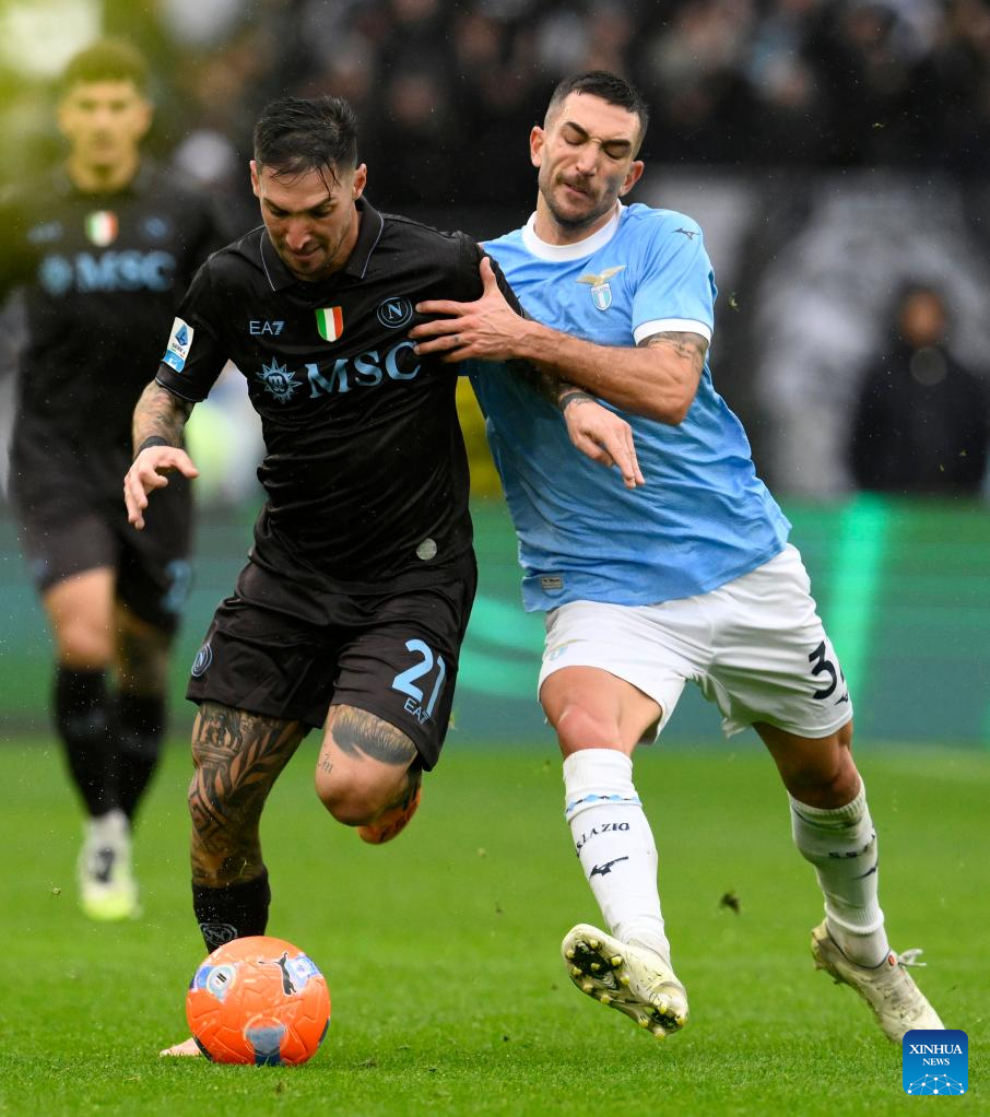 Napoli's Matteo Politano (L) vies with Lazio's Danilo Cataldi during a Serie A football match between Lazio and Napoli in Rome, Italy, Jan. 4, 2026. (Photo by Augusto Casasoli/Xinhua)
