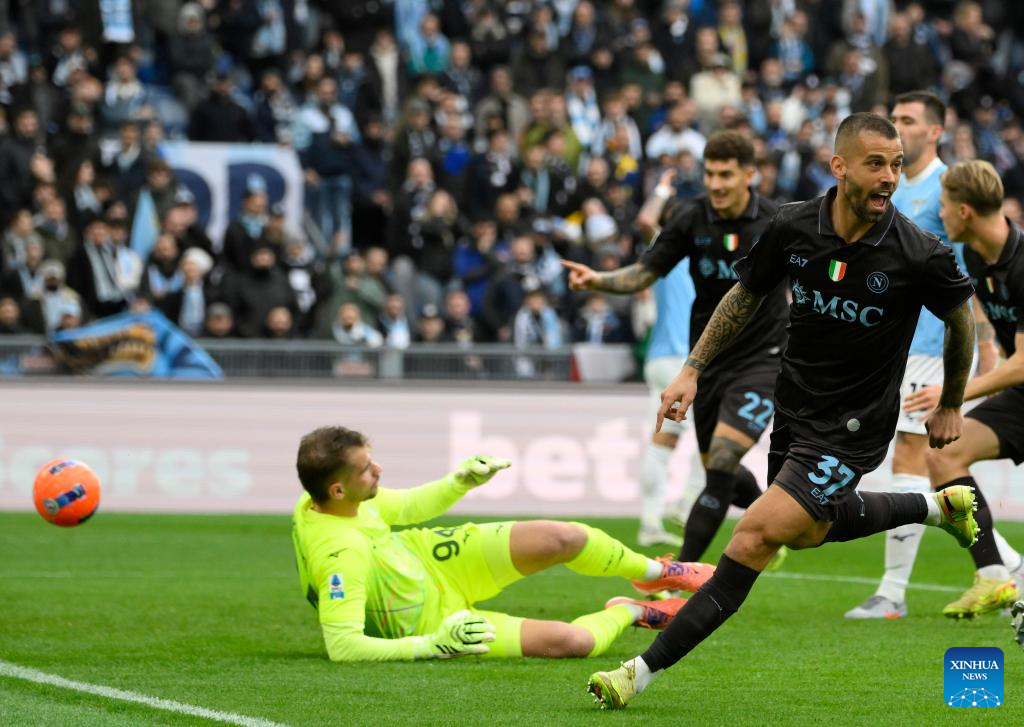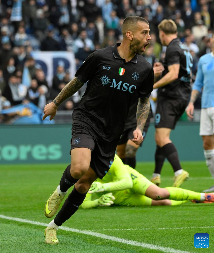 Napoli's Leonardo Spinazzola celebrates his goal during a Serie A football match between Lazio and Napoli in Rome, Italy, Jan. 4, 2026. (Photo by Augusto Casasoli/Xinhua)