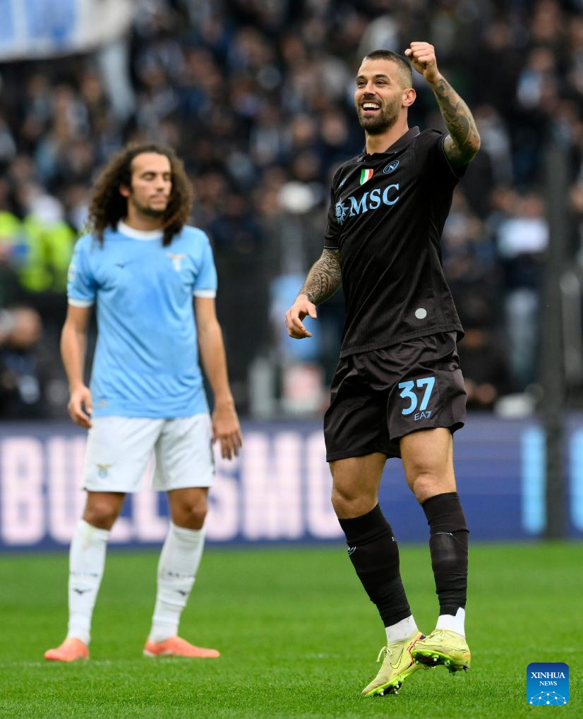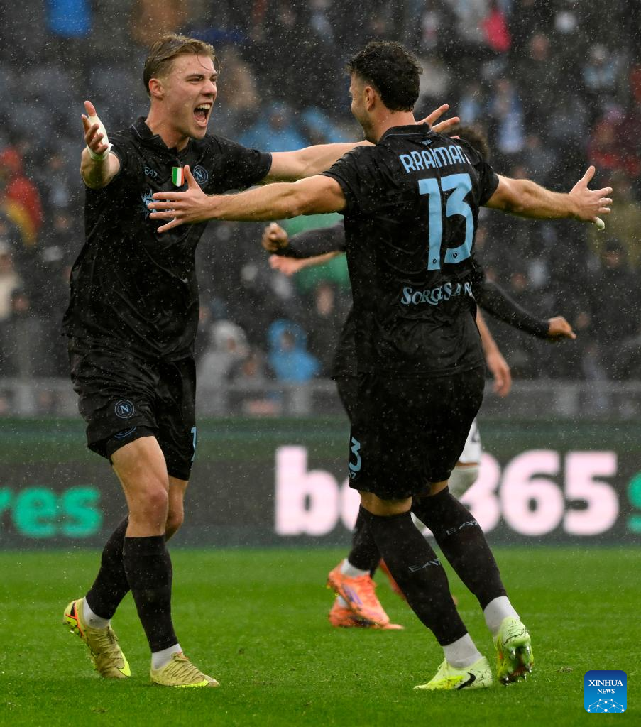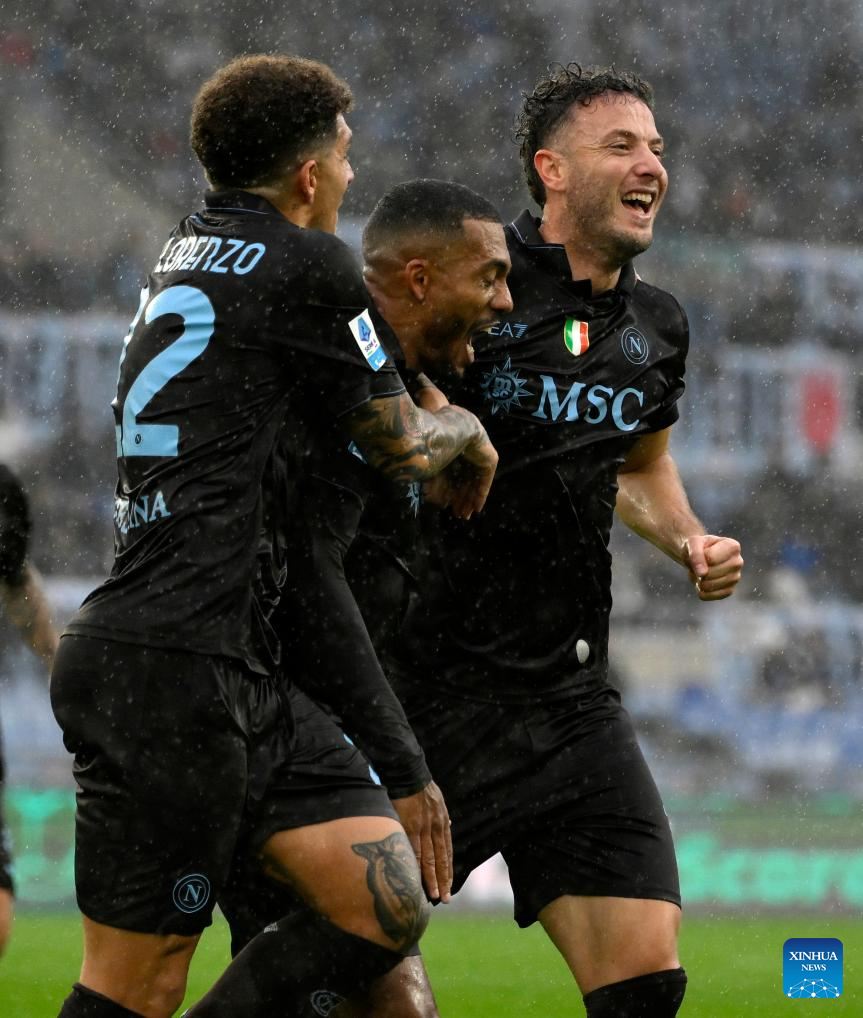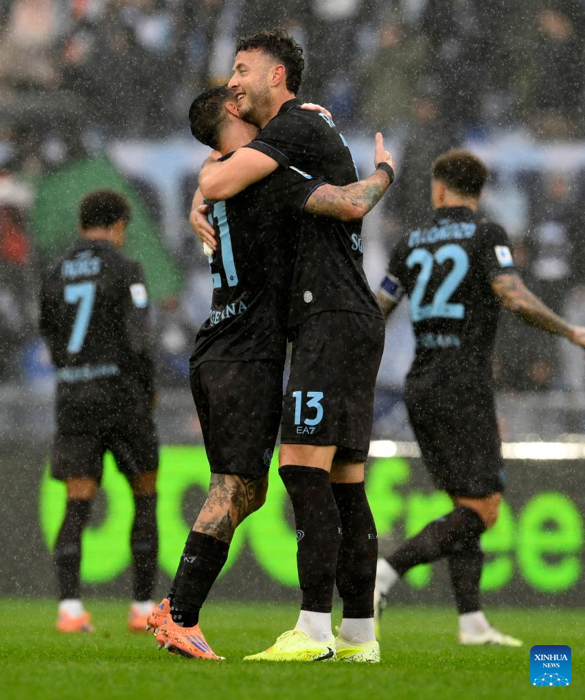 Napoli's Leonardo Spinazzola (R) celebrates his goal during a Serie A football match between Lazio and Napoli in Rome, Italy, Jan. 4, 2026. (Photo by Augusto Casasoli/Xinhua)