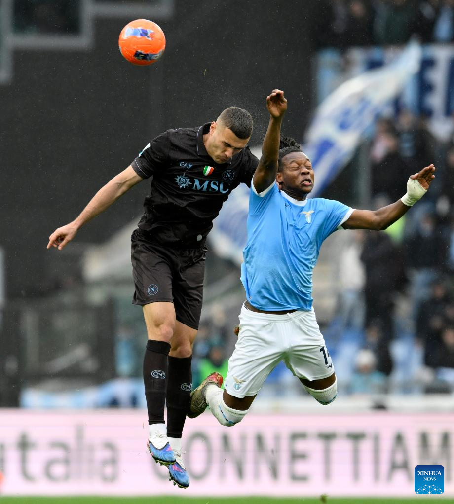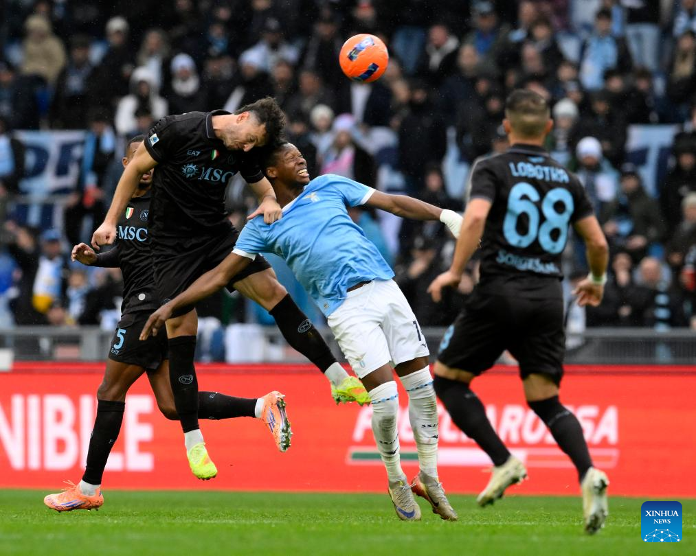 Napoli's Amir Rrahmani (top L) vies with Lazio's Tijjani Noslin during a Serie A football match between Lazio and Napoli in Rome, Italy, Jan. 4, 2026. (Photo by Augusto Casasoli/Xinhua)