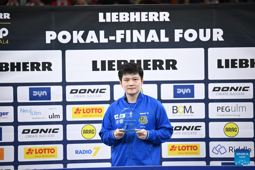 BERLIN, Jan. 5 (Xinhua) -- Chinese table tennis star Fan Zhendong claimed his first overseas club title after leading 1. FC Saarbrucken Tischtennis to a 3-1 victory over TTC RhonSprudel Fulda-Maberzell in the German Cup final in Neu-Ulm on Sunday.